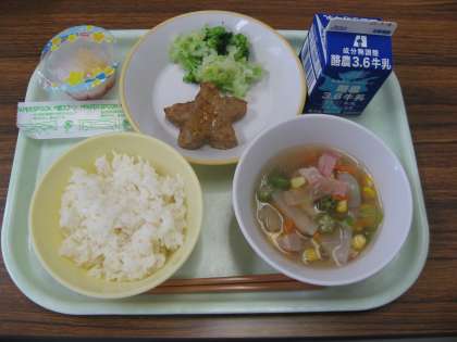 7月3日(月)今日は「七夕献立」で、ごはん・牛乳・星形ハンバーグ・そえ野菜・天の川スープ・七夕ゼリーでした。ハンバーグ、ゼリー、スープにと、星型がたくさんあり、一足早い七夕を味わっていました。今日もおいしくいただきました。
