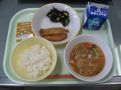 7月10日(月)今日の献立は、ごはん・牛乳・わかさぎのフリッター・ひじきのごま和え・冬瓜のそぼろあん・野菜ふりかけでした。今が旬の「冬瓜」が登場しました。富山県では、「かもり」と呼ばれています。緑色の皮はかたいので、切る作業は大変だったと思います。いつもありがとうございます。今日もおいしくいただきました。