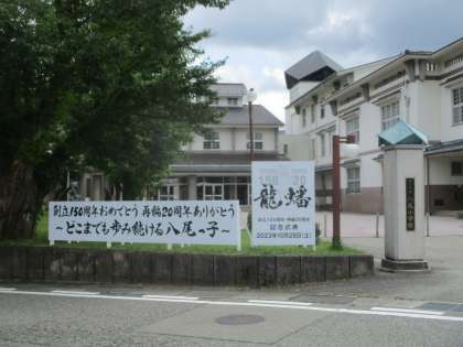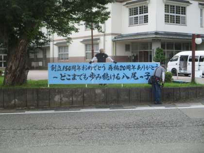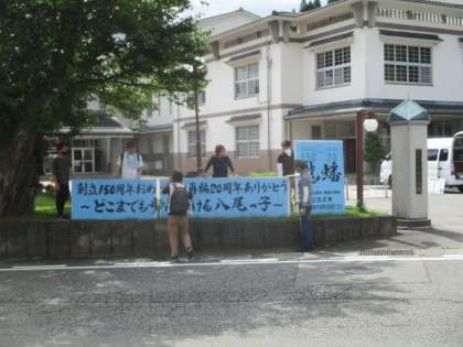 創立150周年、再編20周年を迎えた今年度、学習発表会当日の午後に記念式典を予定しています。それに向けた準備を、PTA役員の方々を中心に進めていただいているところです。今日、その式典に向けた看板が設置されました。