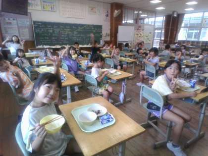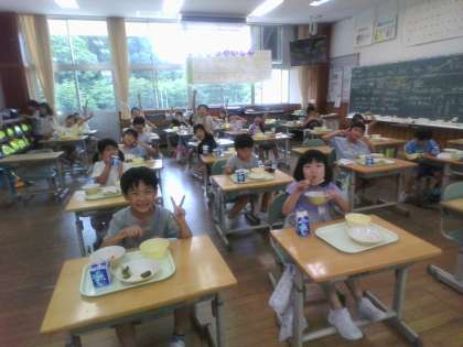今日は1学期最後の給食でした。給食の時間が大好きな子供たちです。「食べキリンができたね」「ご飯粒一つ残っていないよ」と話していました。