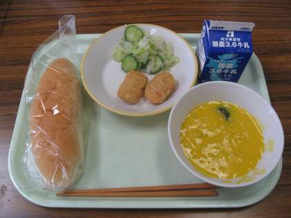 9月7日(木)今日の献立は、コッペパン・牛乳・チキンナゲット・えごまドレッシングサラダ・かぼちゃポタージュでした。えごまは、山田地区で生産されたものを使用しています。粉末にしたえごまの葉をドレッシングに混ぜて、野菜と和えました。教室では、えごまの葉のクイズをしました。何の葉と似ていたか聞いてみてください。今日もおいしくいただきました。