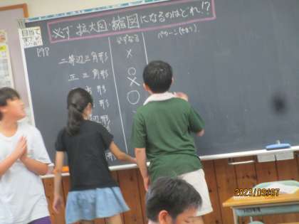班ごとに図形の特徴を話し合い、「正〇角形は、必ず拡大図・縮図になる」と結論を出すことができました。