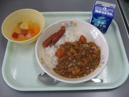 9月12日(火)今日の献立は、カレーライス・牛乳・あらびきウィンナー・フルーツカクテルでした。給食委員会の放送では、カレーの「かくし味」について紹介してくれました。覚えているか聞いてみてください。
