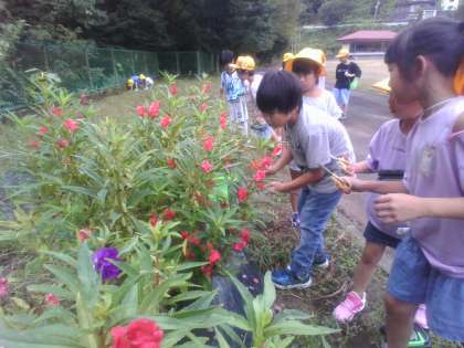 「いきものだいすき」の学習では、グラウンドや畑でバッタやいもむしなどの昆虫や、カエルやトカゲといった爬虫類を見つけました。ケージにすみかを作ったり、食べ物を入れたりして育てたいと目を輝かせる子供たちでした。飼育の仕方を本やクロムブックを使って調べました。