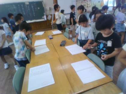 自学係が自学グランプリを開きました。ていねいにびっしり書かれている「ピカピカノート」を探して一人一枚シールを貼りました。選ばれた子は、賞状やトロフィーを受け取り、嬉しそうでした。次回は10月12日(水)、教科は算数で開催します。