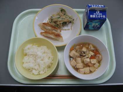 10月6日(金)今日の献立は、ごはん・牛乳・焼きぎょうざ・ナムル・えびと豆腐のうま煮でした。今日は、就学時健診で、いつもより早めの給食でした。朝早くから準備してくださった調理員さんに感謝です。今日もおいしくいただきました。