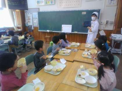 給食に柿が出ました。給食の先生に柿を剥く様子を動画で見せていただきました。「きれいに剥いてくれてありがとう」「美味しいよ、食欲の秋だね」と話す子供たちです。にこやかな給食の時間になりました。