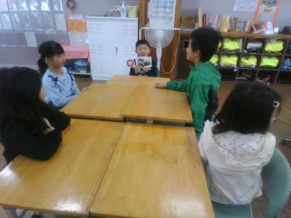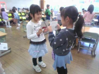 「じどう車くらべ」の学習では、カードを使って、自動車の名前やしごと、つくりについてクイズを出しています。「この車は、なんという名前でしょう」「この車は、救急車です」というように受け答えの練習をしています。班やペアで楽しく活動しています。