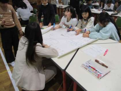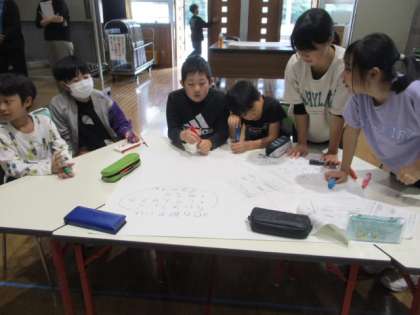 後半の学習は、八尾町の好きなところやなくなってほしくないところ、これからの八尾町がどのようになってほしいかをグループごとに話し合いながら、大きな紙にまとめていきました。好きなところは、「町の人がやさしい」「おわらや曳山がある」「自然がいっぱいなところ」などいろいろな意見が出ました。普段の生活経験の中から感じていることをもとに「お年寄りにやさしい親切な町になるといい」「大きな公園をつくって、町の人とふれ合えたらいいな」など、それぞれが、違った素敵な八尾町の未来を語っていました。