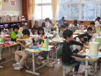 図画工作科では、帽子づくりの学習を進めています。色々な材料に触れながら、新しい発想が出てくる場面も見られました。材料の切り方、組み合わせ方、貼り付け方に、一人一人の工夫が表れています。完成が楽しみです!!