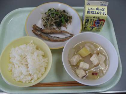 10月16日(月)今日の献立は、ごはん・牛乳・ししゃもの米粉揚げ・磯和え・さつま汁でした。ししゃもは、漢字で「柳葉魚」と書きます。クイズを出したので、覚えているか聞いてみてください。ししゃもは、米粉をまぶして油で揚げました。からっと揚がっていて、おいしかったです。