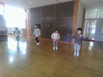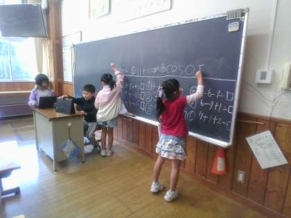 休み時間には、学校ごっこや縄跳びを楽しんでいます。先生役の子が黒板に文字を書いて子供役の子に話しかけていました。縄跳びでは、かけ足飛びが人気です。