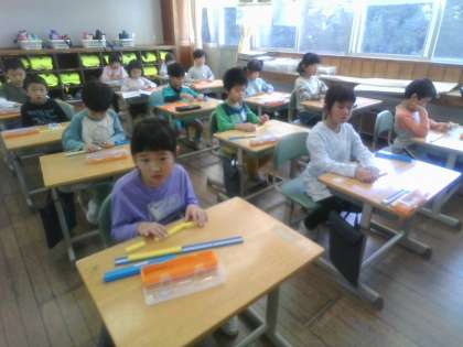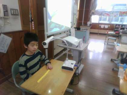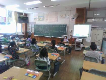 繰り上がりのあるたし算を学習しています。ブロックを使って、計算の仕方を説明しました。図や言葉を使って、ノートにも考えをまとめました。「こうすると10のまとまりができるよ」「10のまとまりをつくると計算しやすくなるね」と気付いたことを話し合っていました。