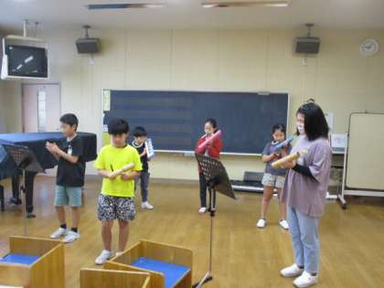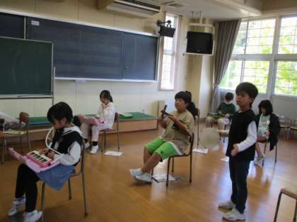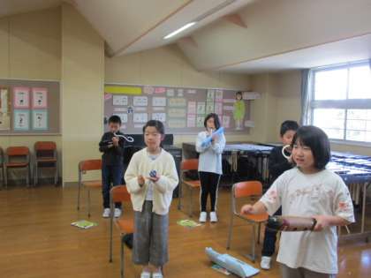 音楽では、グループごとに分かれて「楽しいマーチ」という曲を合奏しています。曲に合わせてリズム打ちが2種類あり、掛け合いのようになっていて楽しい曲です。それぞれに楽器を選び、友達の音をよく聞きながら練習していました。グループごとに発表した後、全員で合奏を楽しみました。子供たちにとっても大好きな思い出の曲になりました。