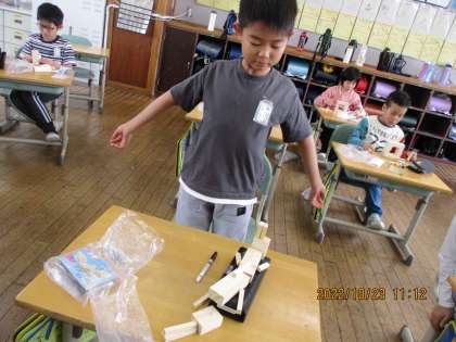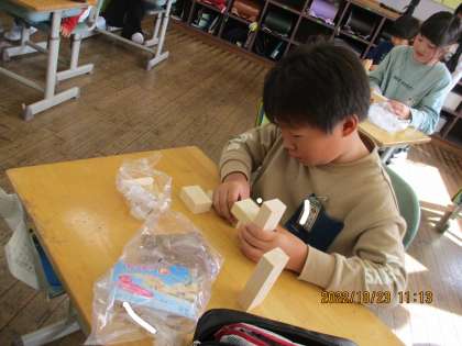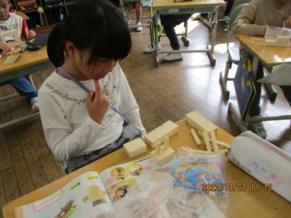 図画工作科の学習では、くぎうちトントンが始まります。今日は1時間目として、木材を用いて見立て遊びをしました。