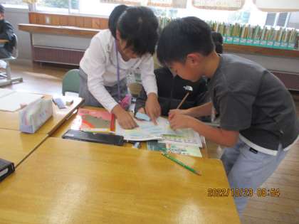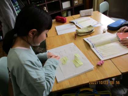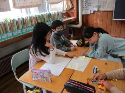 国語科考えをまとめる話合いの学習の様子です。先日、考えを広める話合いとしてたくさんの考えを発表しました。今日はそれぞれの案から、絞っていくための話合いをしました。