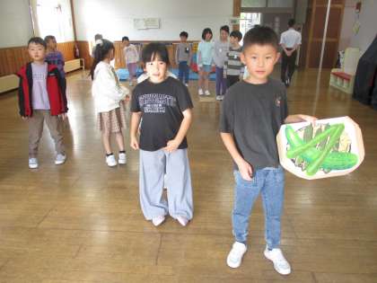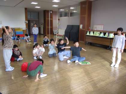 今日は物を持って発表する子の動きを考えました。動きながら物を見せると、声が届きにくくなることをみんなで確認しました。また、友達の振り付けも、グループのみんなで一緒に考え直しました。毎日よりよいものに仕上げていっています。