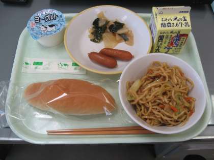 10月26日(木)今日の献立は、減量コッペパン・牛乳・あらびきウインナー・こんにゃくサラダ・焼きそば・ヨーグルトでした。給食の献立の中でも、人気の高い「焼きそば」ですが、調理する方は、重労働です。野菜と麵を一緒に炒めるのは、とても力のいる作業です。二人掛かりで、調理し、とってもおいしい焼きそばに仕上がりました。どの学年も、おいしく食べていました。