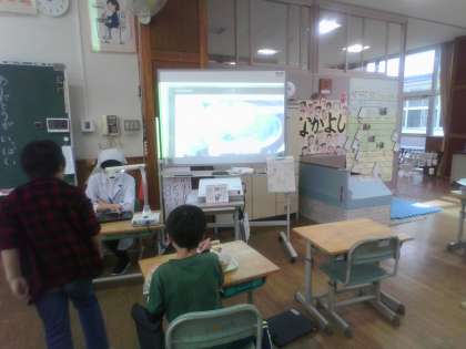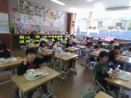 やきそばが大人気でした。給食の先生にやきそばを作っている様子の写真や動画を見せてもらいました。「大きい釜で作っていて、すごいな」「みんなの分を作るには、時間がかかるんだね」給食作りの苦労を知り、給食を残さず食べる子供たちでした。