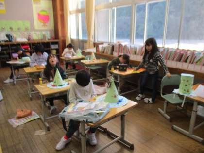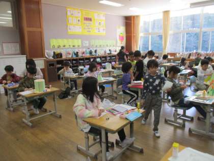 紙を丸めて筒状、リング状にする工作が、実は中心となる学習活動なのですが、子供たちはそのあとの飾りつけをとても楽しみにしており、たくさんの材料を用意して持ってきていました。「おうちの人と一緒に買ってきた!」と何人もの子供たちが嬉しそうに教えてくれました。ご協力いただき、本当にありがとうございました。