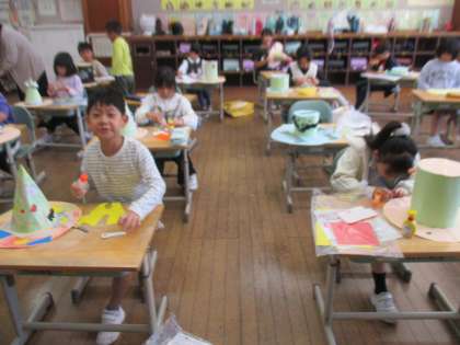 「わっかで変身」の単元で、帽子つくりを行いました。