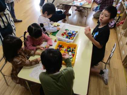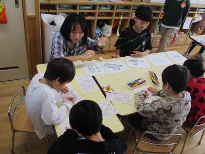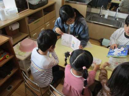 教室では、五つのお店を回るスタンプラリーをしました。ブロック遊びや塗り絵のお店では、保育所の子供たちに「上手だね」「きれいにできたね」と進んで話しかけている姿が見られました。読み聞かせのお店では、好きな本を選んでもらい、一緒に読んでいました。