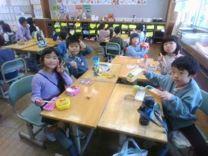 学習発表会を終えて、待ちに待ったお弁当の時間。美味しいお弁当に大満足の子供たちでした。笑顔がこぼれています。
