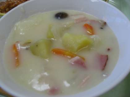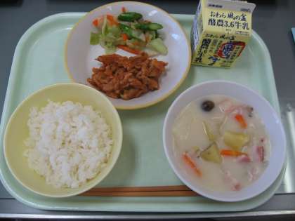 10月31日(火)今日の献立は、ごはん・牛乳・ポークチャップ・アスパラサラダ・秋のかおりシチューでした。今が旬のさつまいもがたっぷり入ったおいしいシチューになりました。今日のさつまいもは、鹿児島県産の紅はるかです。ほくほくして、とても甘かったです。今日もおいしくいただきました。