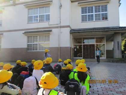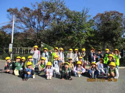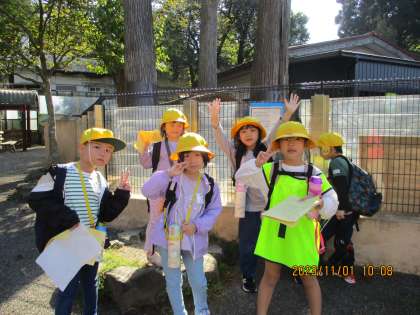 学校へ元気に「行ってきます」と挨拶をして、ファミリーパークへ行ってきました。動物を見たり、飼育員さんに話を聞いたりして、動物にくわしくなりました。「にわとりがたまごを産みそうだよ、ドキドキするね」「キリンは座って寝るんだよ」「わたしの家にもコウモリが来たことがあるよ」自分たちの経験と結びつけて話す子供たちでした。