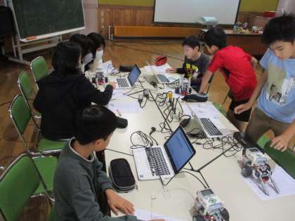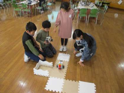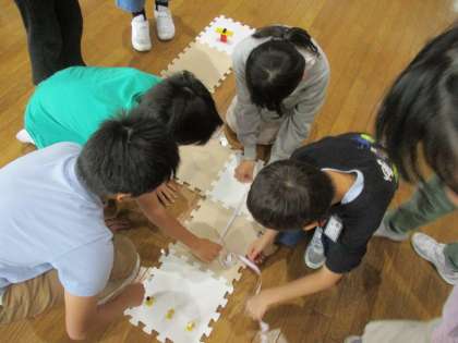 ペアで協力して目的地までの長さを測り、動きをプログラムして試しました。失敗したところを友達と相談し、何度も数値を変更しながら目的地を目指しました。失敗することも楽しんで活動している子供たちでした。