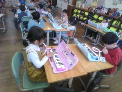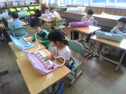 せんりつでよびかけあう学習をしています。やまびこのようによびかけあって歌ったり、鍵盤ハーモニカで演奏したりしています。「高くなったり低くなったりしているから坂道を散歩しているみたいだね」「ドで終わると話が終わったみたいだな」と話す子供たちでした。