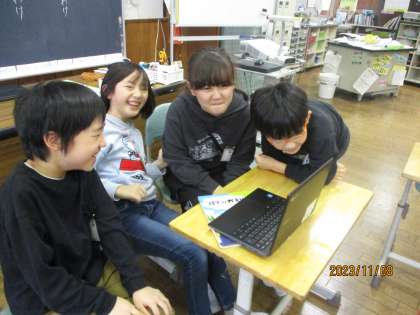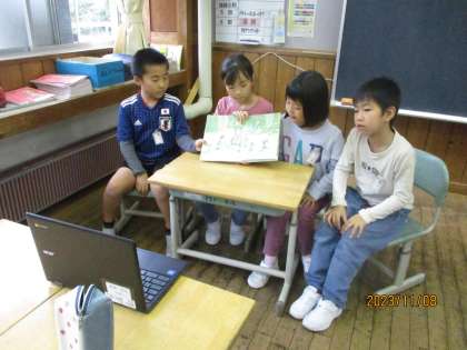 国語の話合いの学習として、「1年生に読み聞かせる本を決めよう」というものがありました。その学習を生かして、グループごとに1年生に読み聞かせを行いました。そのために昨日は、クロムブックを使って自分たちの姿を撮影しながら練習していました。