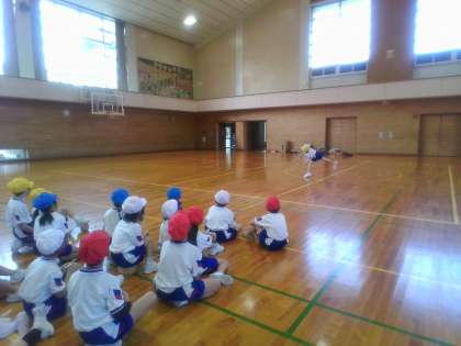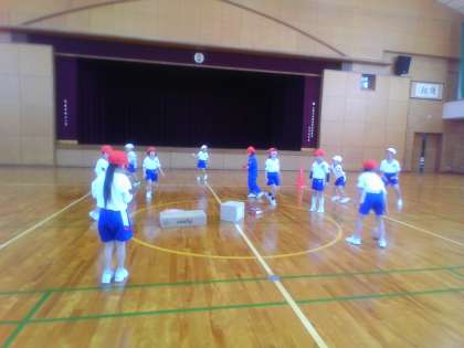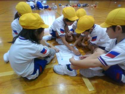 ボール投げゲームでは、積み上げた空き箱をボールを投げてくずす「攻め」とボールをカットする「守り」に分かれてゲームをしました。ホワイトボードとマグネットを使って作戦会議をしたり、強いボールの手本を見たりしました。「下の箱を狙うと全部崩せるよ」「フェイントをかけて、空いているところを狙うといいよ」と教え合う子供たちでした。