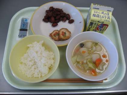 11月21日(火)今日の献立は、ごはん・牛乳・野菜の肉巻き・煮豆・大漁なべ・のり佃煮でした。今日の煮豆は、「金時豆」です。甘い味付けで、ふっくらと仕上がりました。大漁なべには、「鱈」の角切りとつみれが入って、魚介のうま味がたっぷりと味わえました。今日もおいしくいただきました。