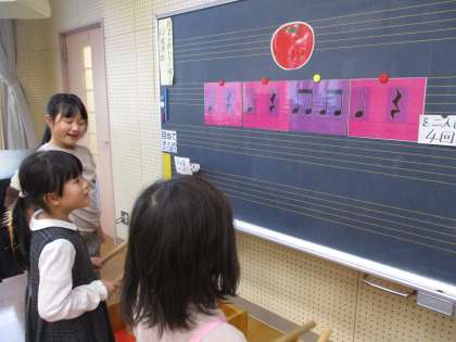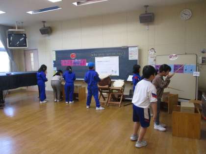 たいこでおまつりの音楽をつくる学習をした二年生。「学校で太鼓のゲームができたらいいな…」ということで、ゲームセンターならぬたいこセンターを設置しました。子供たちは、一人であるいは二人で、ミッションで与えられたリズムを演奏します。