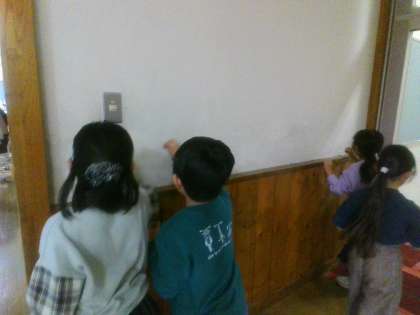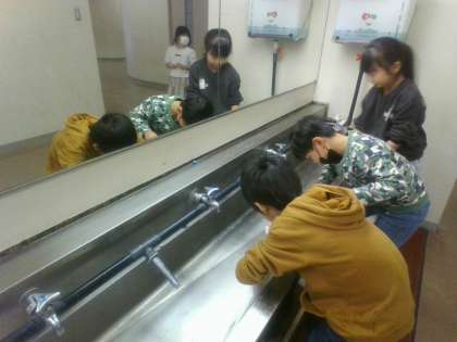 普段、掃除ができていない、洗面所の水垢や壁の汚れをスポンジで磨いています。「あっという間に12月だね、大掃除をがんばりたいな」「汚れが落ちるときもちがいいね」と話す子供たちでした。