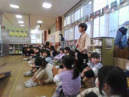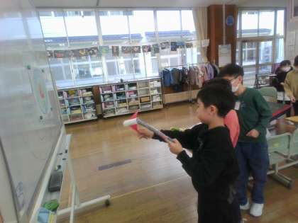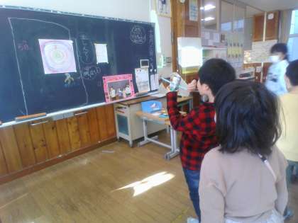 2年生の動くおもちゃのお店に招かれて、遊んできました。風やゴムの力で動くおもちゃの説明を受けて、遊んで楽しみました。「景品をたくさんもらって嬉しかったよ」「いろんな工夫を自分たちもまねしてみたいな」「折り紙やおもちゃの作り方を教わりたいな」「楽しく遊んでいい思い出になったよ」と話す子供たちでした。