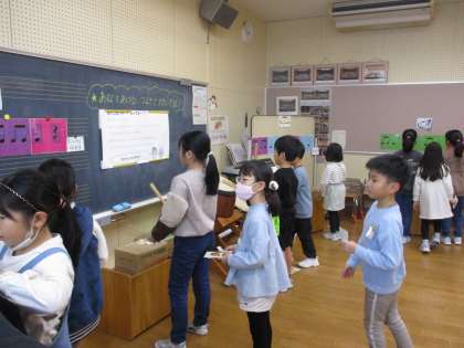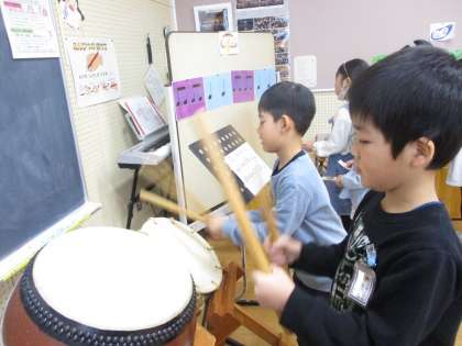 楽しみにして毎日通っていた子もたくさんいました。子供たちの様子を見ていると、日に日にリズムに慣れ親しみ、体全体で楽しく演奏しているようでした。音楽の授業ではたいこ以外の打楽器を使って、また友達と一緒に演奏していきましょう!