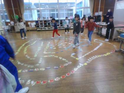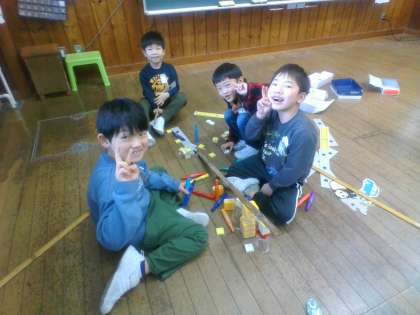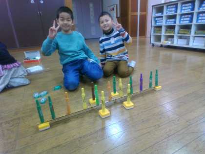 「ならべてならべて」の学習では、身の回りのものを並べて遊びました。迷路やピタゴラスイッチ、おままごとやおみせやさんなど、想像を膨らませて思い思いに表現しました。