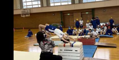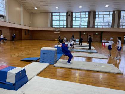 三学期の体育で跳び箱運動を行っています。六年生が習得を目指す技として、かかえこみ跳び、伸膝台上前転、頭はね跳びがあります。