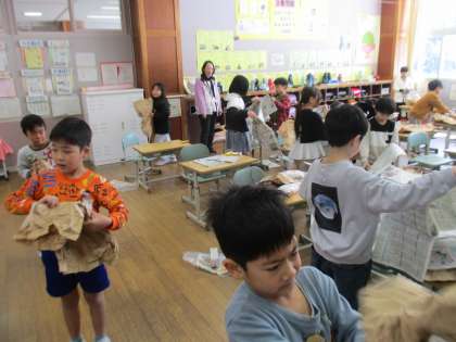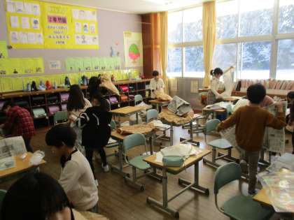 紙を思い切りくしゃくしゃにする感覚が面白かったようで、子供たちは一生懸命に紙をつぶしたりもんだりして柔らかくしていました。