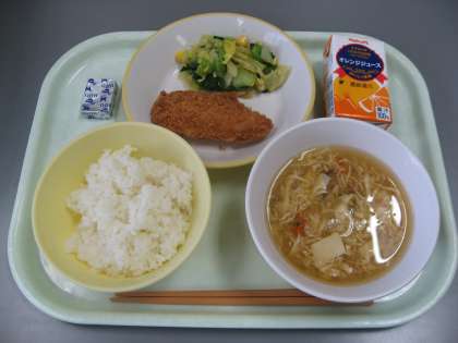 学校給食週間2日目は、「瞬発力アップ献立」でした。久しぶりの「オレンジジュース」に盛り上がり、おかわりじゃんけんは真剣でした。瞬発力アップのための、「たんぱく質」、筋肉をスムーズに動かす「カルシウム」、疲労回復効果のある「クエン酸」を含む食材を組み合わせた献立でした。今日もおいしくいただきました。