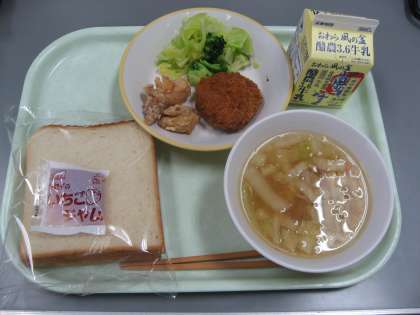 今日は、30日に予定していた「鶏肉とじゃがいものうま煮」に入る鶏肉を、から揚げにしてくださり、メンチカツと一緒においしくいただきました。調理員さんに感謝です。