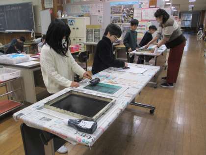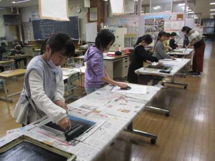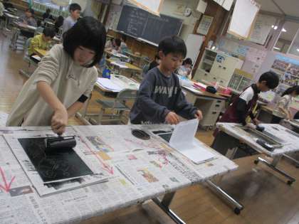 頑張って彫刻刀で彫った板を刷りました。思いを込めて刷っていました。