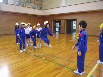 体育の時間には8の字跳びの練習をしています。最初は入るタイミングが分からなかった子も、友達が入るタイミングで声をかけたり背中を押したりしてくれることで、タイミングをつかんできました。