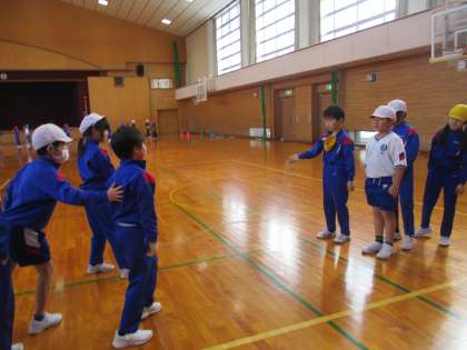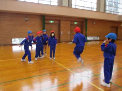 体育の時間には8の字跳びの練習をしています。最初は入るタイミングが分からなかった子も、友達が入るタイミングで声をかけたり背中を押したりしてくれることで、タイミングをつかんできました。