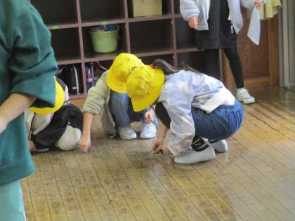大きな荷物を運ぶ子供たちからは、「ほりきのみっつのようかんぼう」の掛け声が聞こえ、水拭きをする子供たちからは、「どこが汚れているかな」「汚れが落ちると気持ちがいいな」との声が聞こえてきました。みんなで協力して隅々まで汚れを落とすことができました。
