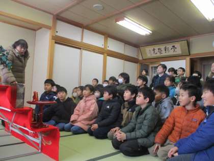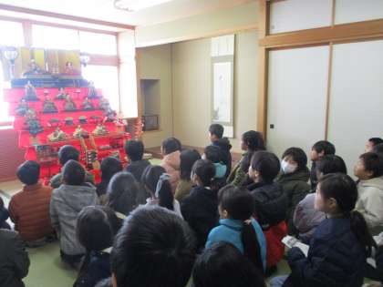 3年生みんなでひな人形を見て、歌を歌いました。歌詞の意味や、飾りの意味を知った子供たち。興味津々でひな人形を見ていました。