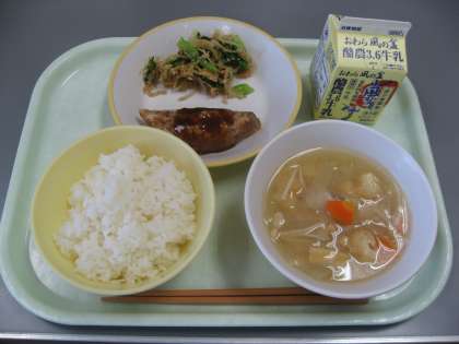 今日の魚は、富山県民から愛される「ふくらぎ」でした。給食では、何回も登場しています。ふくらぎに米粉をまぶし、油で揚げます。からっと揚がった魚に、水、しょうゆ、砂糖、みりんを合わせて作ったたれをかけました。甘塩っぱいたれが、「みたらしだんごの味がする」と言いながら、おいしく食べていました。