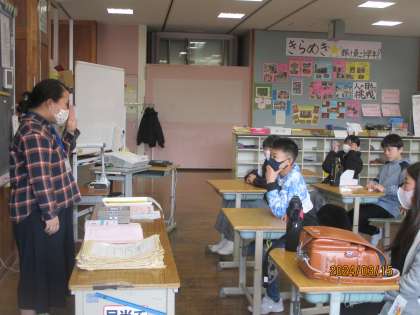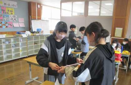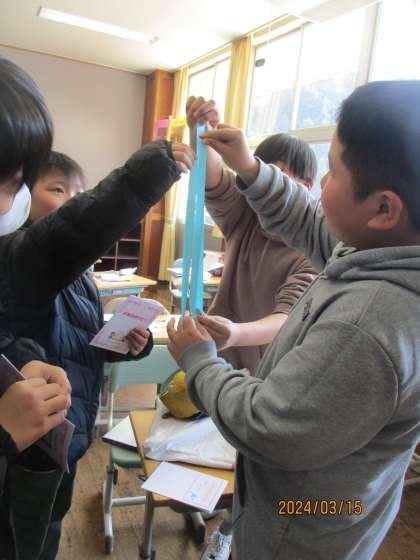 養護教諭の竹島先生から、6年間の身長と体重の変化をグラフに表した成長の記録をいただきました。くくってあったリボンは身長の伸びを表しています。さっそく広げて、友達と比べていました。